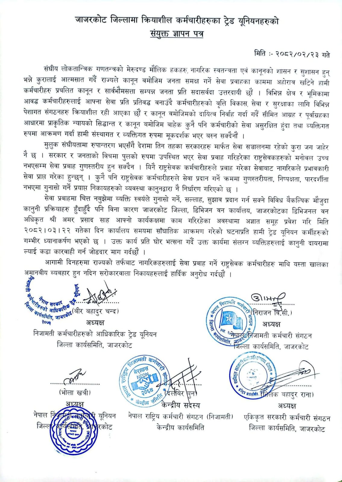 विज्ञप्तीमा हस्ताक्षर गर्नेहरुमा वीर बहादुर चन्द अध्यक्ष निजामती कर्मचारीहरुको आधिकारीक ट्रेड युनियन जिल्ला कार्यसमिति जाजरकोट । निराजन वि.सी. अध्यक्ष नेपाल निजामती कर्मचारी संगठन जिल्ला कार्यसमिती जारकोट ,भोला खत्री अध्यक्ष नेपाल निजामती कर्मचारी यूनियन जिल्ला कार्यसमिति जाजरकोट , दलविर पुन केन्द्र्रीय कार्यसमिति , तिलक बहादुर राना अध्यक्ष एकिकृत सरकारी कर्मचारी संगठन जिल्ला कार्यसमिति, जाजरकोट रहेका छन् ।